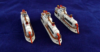 This stuff is really so easy to paint after doing a zillion 28mm Napoleonics. Its basically a lot of drybrushing, a mid-tone wash, pick out the details and you're done. First shown below are a couple of the smallest ships, the Frigates.