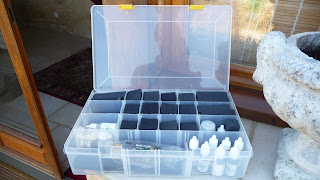 Of course, as things would have it, I decided I wanted to embark on this just before our vacation. Not to be deterred, I mocked up a 'hobby travel kit' so I could work on some test figures while we were away. Below is the case I've been using during our travels. It works quite well as the paint bottles fit upright, I have a separate long compartment for my brushes and tools and it allows me to carry around 30 figures in the padded compartments. As you can imagine my wife looks at this, smiles indulgently, all the while thinking that I'm a little 'touched'...