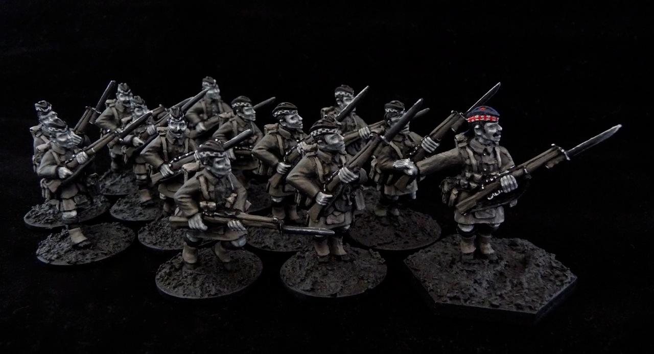 My plan is to have all the rank and file in pure greyscale, but the NCOs and officers will have the chiaroscuro effect of a selected defining colour picked out. Finally, the dead will be painted in full colour (or perhaps their wounds) which should provide a dramatic (and hopefully sobering) contrast to the planned monochrome background.