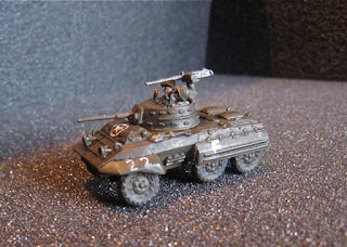 His second entry is a 15mm M8 Greyhound scout car from Battlefront Miniatures. Chris used a gel pen to put in the 'F 22' markings (Fox Company, 2nd Troop, 2nd vehicle).